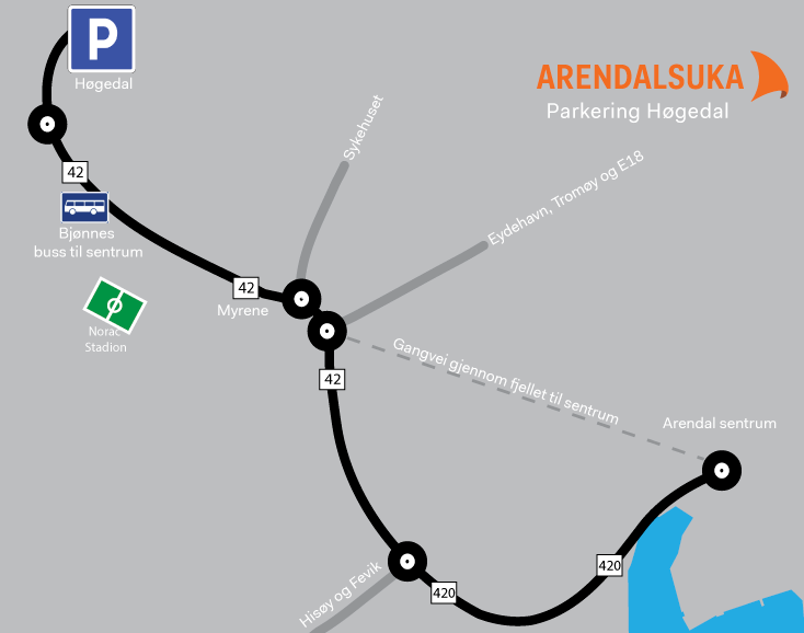 Høgedal parkeringsplass (se kartmarkering) ligger 3 km nordvest for Arendal sentrum. Fra Bjønnes holdeplass tar du linje 110 direkte til sentrum.